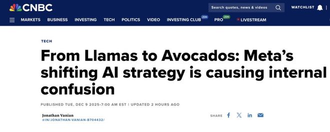 的新模型——而它可能是闭源模型。 也就是说:外界无法再自由查看权重和代码。从Llama到Avocado,Meta的AI路线来回摇摆,让员工无所适从。