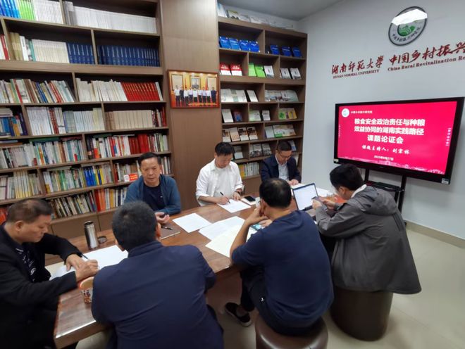 2025年9月27日上午,省社会科学成果评审委员会重大课题《粮食安全政治责任与种粮效益协同的湖南实践路径》(编号:XSP24NYT01A)论证会在湖南师范大学中国乡村振兴研究院召开,该课题由湖南省人大农业委原主任、湖南省农村发展研究院院长刘宗林主持,湖南师范大学中国乡村振兴研究院院长陈文胜教授及陆福兴教授、胡扬名教授、瞿理铜副教授、谢宗藩硕导、程中培讲师参会,围绕课题展开深入研讨与论证。